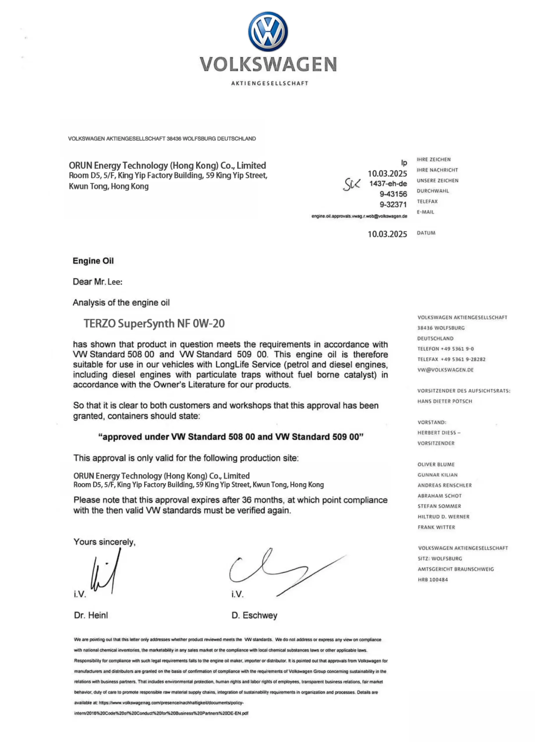 Formulations like those in the SuperSynth series menggunakan Teknologi Liquid T-M OFA for similar atomic-level protection, achieving up to 51% friction reduction. This aligns with 508 00 vw oil demands for thermal stability across -40°C to high-operating temps. For specs, Terzo lubricant emphasize 100% virgin bases with high viscosity indices (e.g., 145+), ensuring compliance with overlapping standards like ACEA C5. Explore Terzo’s SuperSynth 0W-20 for a robust alternative.